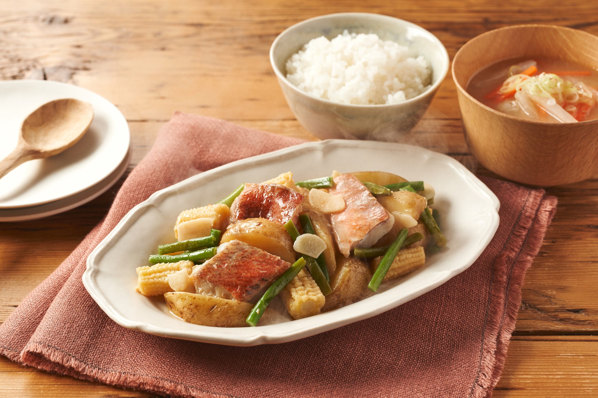 クセがなく食べやすいアラスカ産の天然赤魚を塩で〆て旨みを引き出した後、ゴロっと野菜と一緒にガーリック入りソースに合えました。ほくほくのじゃがいもとしっとりとした赤魚がガーリックソースによく合います。隠し味に加えた醤油がアクセントになり、お箸が進む一品です。