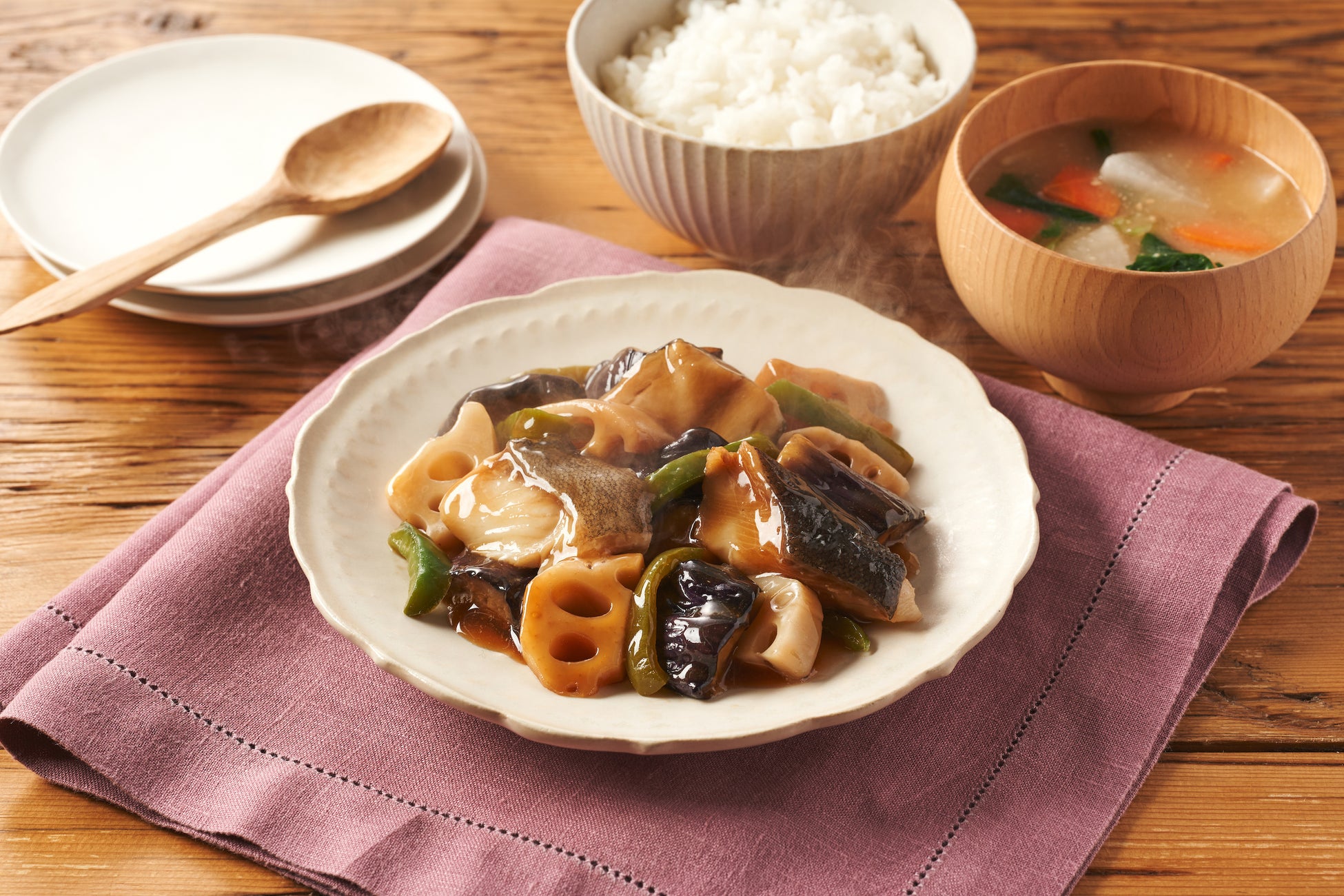 柔らかく脂がのって美味しいアラスカ産天然銀鱈を塩で〆て旨みを引き出した後、ゴロっとしたレンコンや揚げなす、彩りのピーマンと合わせた甘酢あんかけです。 甘酢あんに使用している黒酢特有の風味とコクは、銀鱈との相性も良く、さっぱりしつつもまろやかな味に仕上げてくれます。
