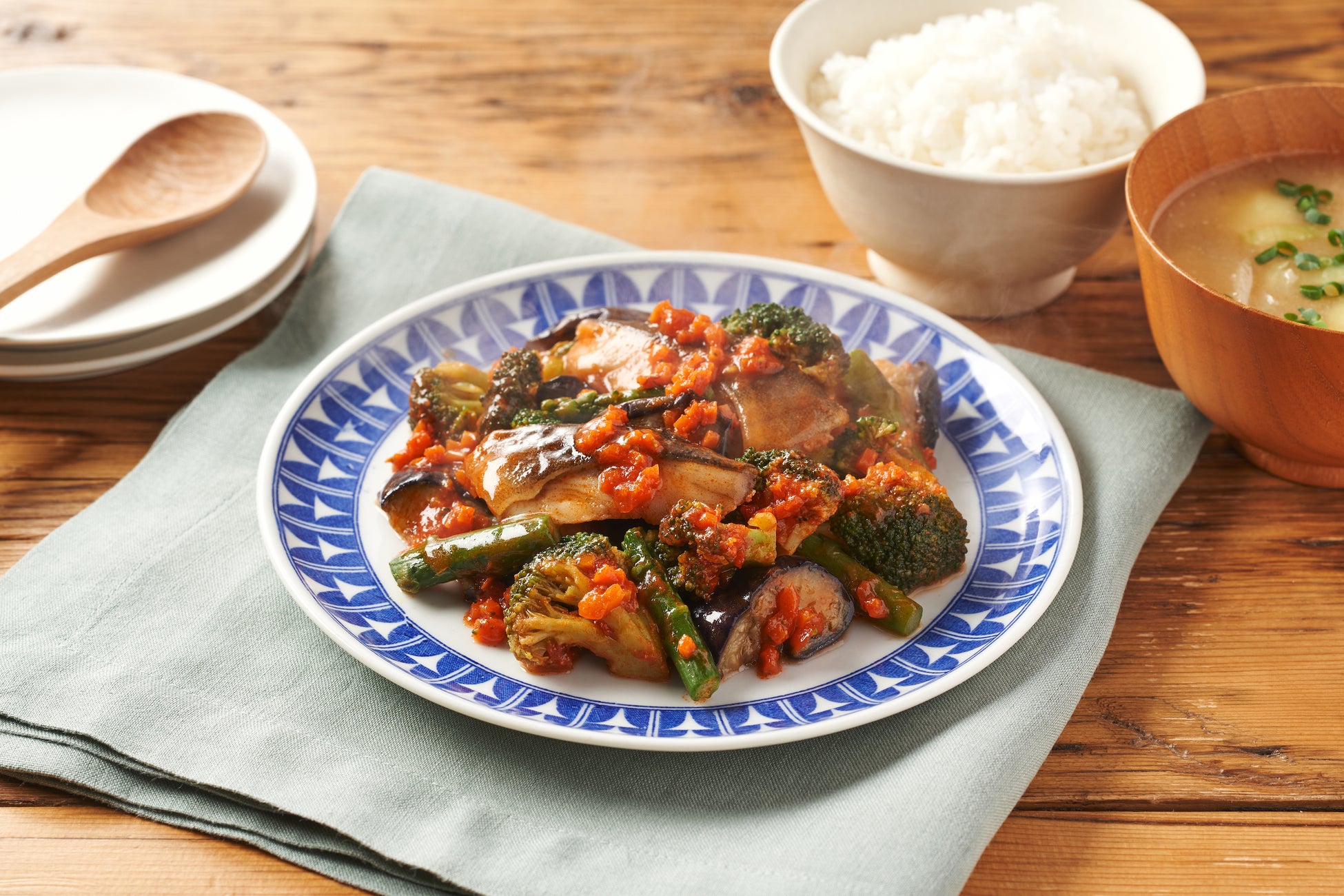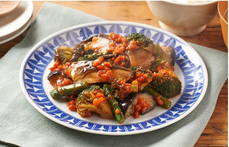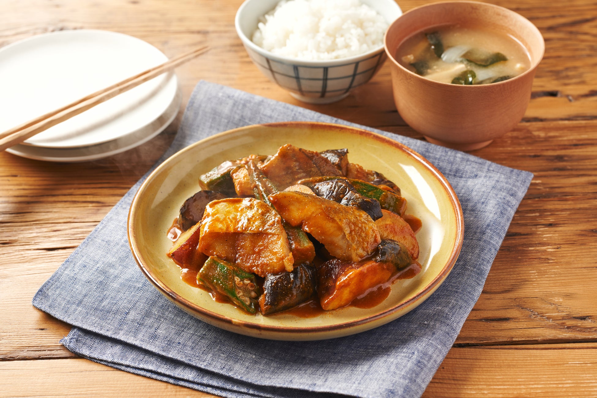 身がしっかりしているアラスカ産の天然スケソウダラを塩で〆て旨みを引き出した後、ゴロっと野菜と一緒に特製のカレーソースに合わせました。かつおの旨味をきかせ、クミンやコリアンダーなどのスパイスの香りがきいた特製のカレーソースに、ほのかなトマトの酸味がアクセントとなり、ご飯が進む味わいです。