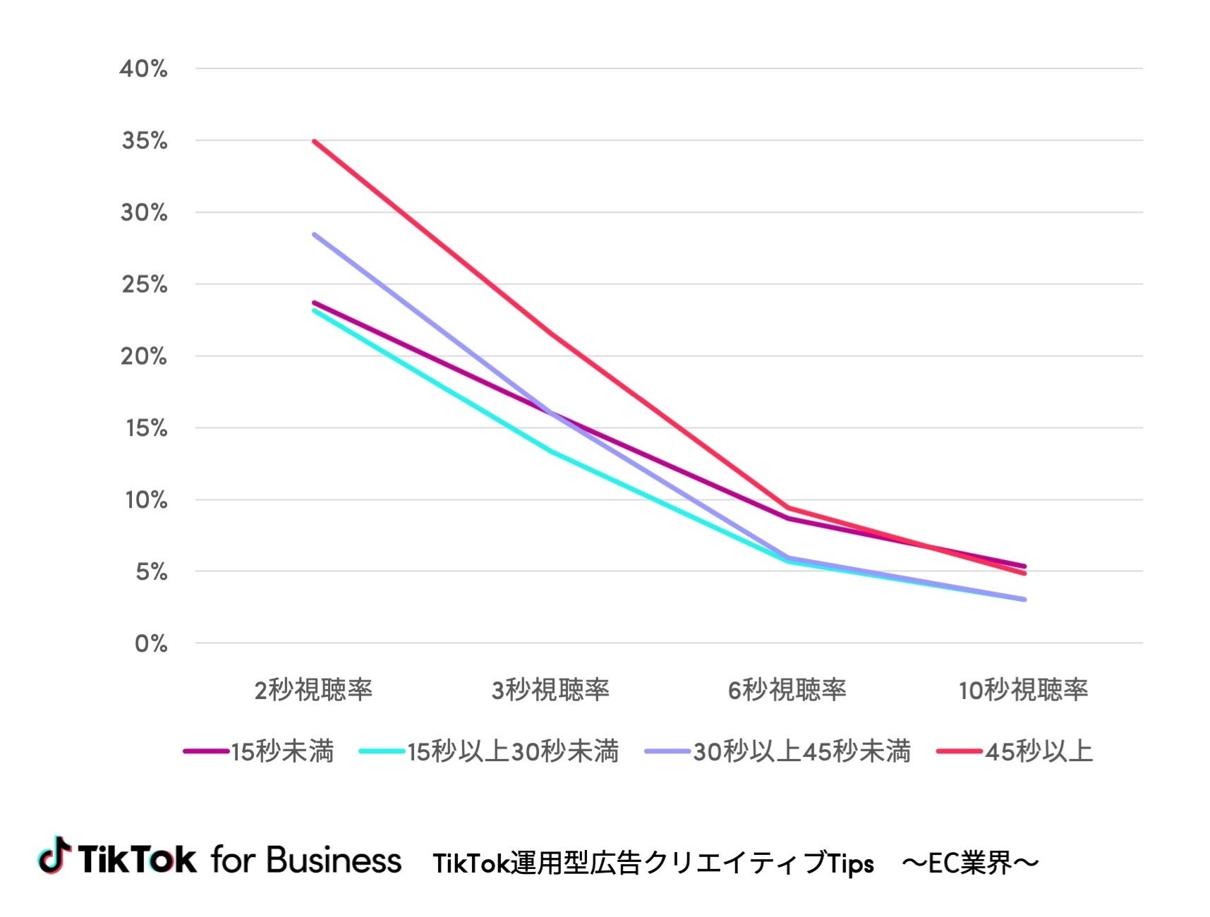 45秒以上の動画は、45秒未満の動画に比べて、2秒視聴率が122.9%、6秒視聴率が108.7%高くなっています。