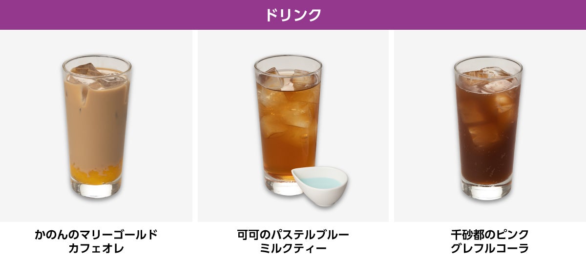 かのんの好物であるカフェオレにイメージカラーのマリーゴールド色のオレンジゼリーを加えます。クラッシュしたオレンジゼリーにコーヒーと牛乳を注いだ、すっきりとした味わいのカフェオレです。