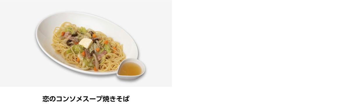 恋の好物であるコンソメスープを焼きそばで表現しました。ベーコン、玉ねぎ、にんじん、キャベツを入れた焼きそばを醤油バターで味付けしました。とろみをつけたコンソメスープをかけていただきます。