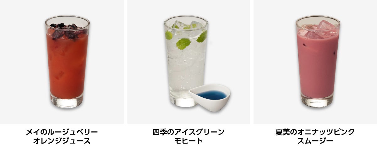四季のイメージカラーであるアイスグリーンをモヒートで表現し、趣味である実験要素を加えました。レモンライムソーダにミントを散らしてモヒート風に仕上げ、バタフライピーティーを別添えします。お客様自身で注ぎ、ドリンクの色が変化する様子を楽しんでいただきます。