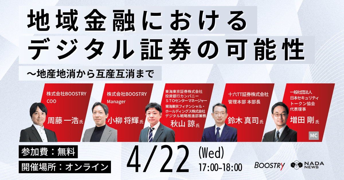 国内有数のWeb3メディア「NADA NEWS(旧CoinDesk JAPAN)」を運営するN.Avenue株式会社(本社:東京都港区、代表取締役:神本侑季)は、株式会社BOOSTRYの協賛のもと、オンラインイベント「地域金融におけるデジタル証券の可能性〜地産地消から互産互消まで」を2026年4月22日(水)17:00より開催します。