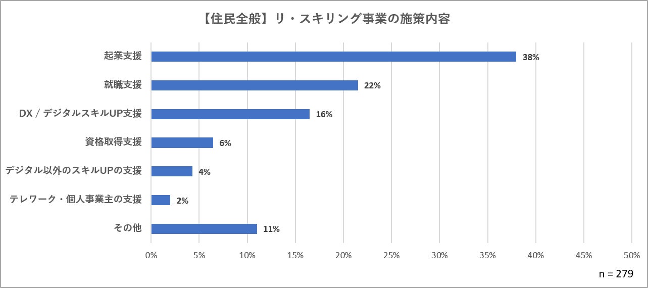 「住民全般」を対象にしたリ・スキリング事業を計画または検討している279自治体に、具体的な施策内容を尋ねたところ、「起業支援(38%)」が最も多く、「就職支援(22%)」が続きました。【図5参照】