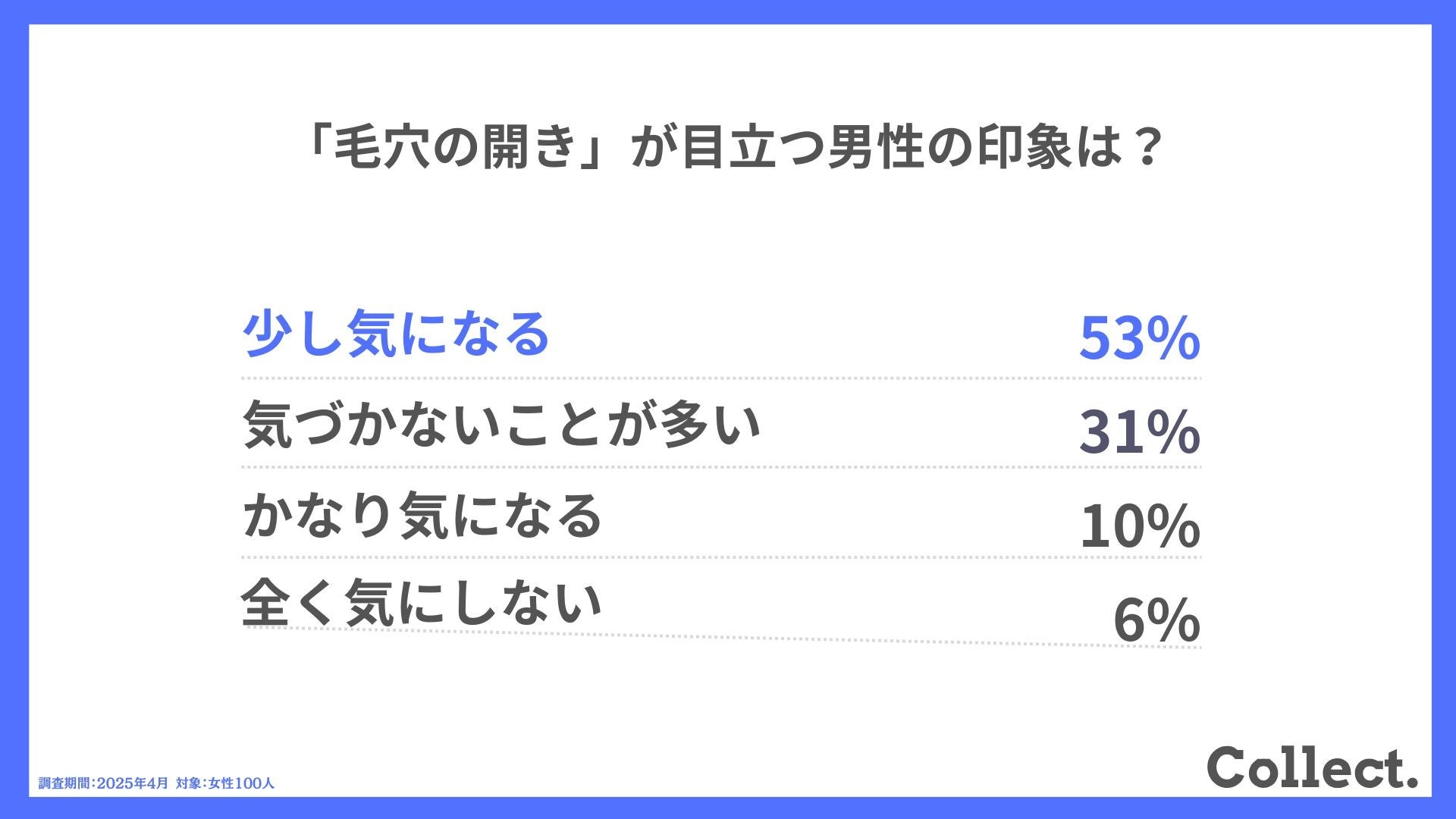 「少し気になる」が半数を超えるも、「気づかない」という声も3割以上。毛穴への意識は高い一方で、許容度の高い人も少なくないようです。