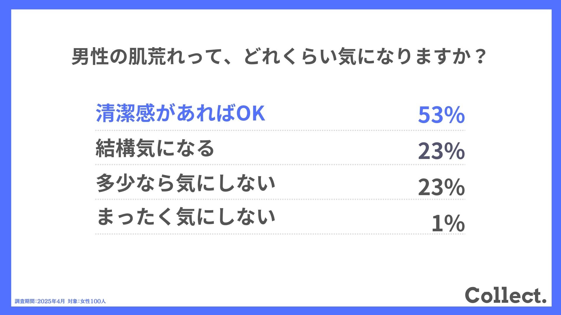 男性の肌荒れについて、約半数の女性が“清潔感があれば気にならない”と回答