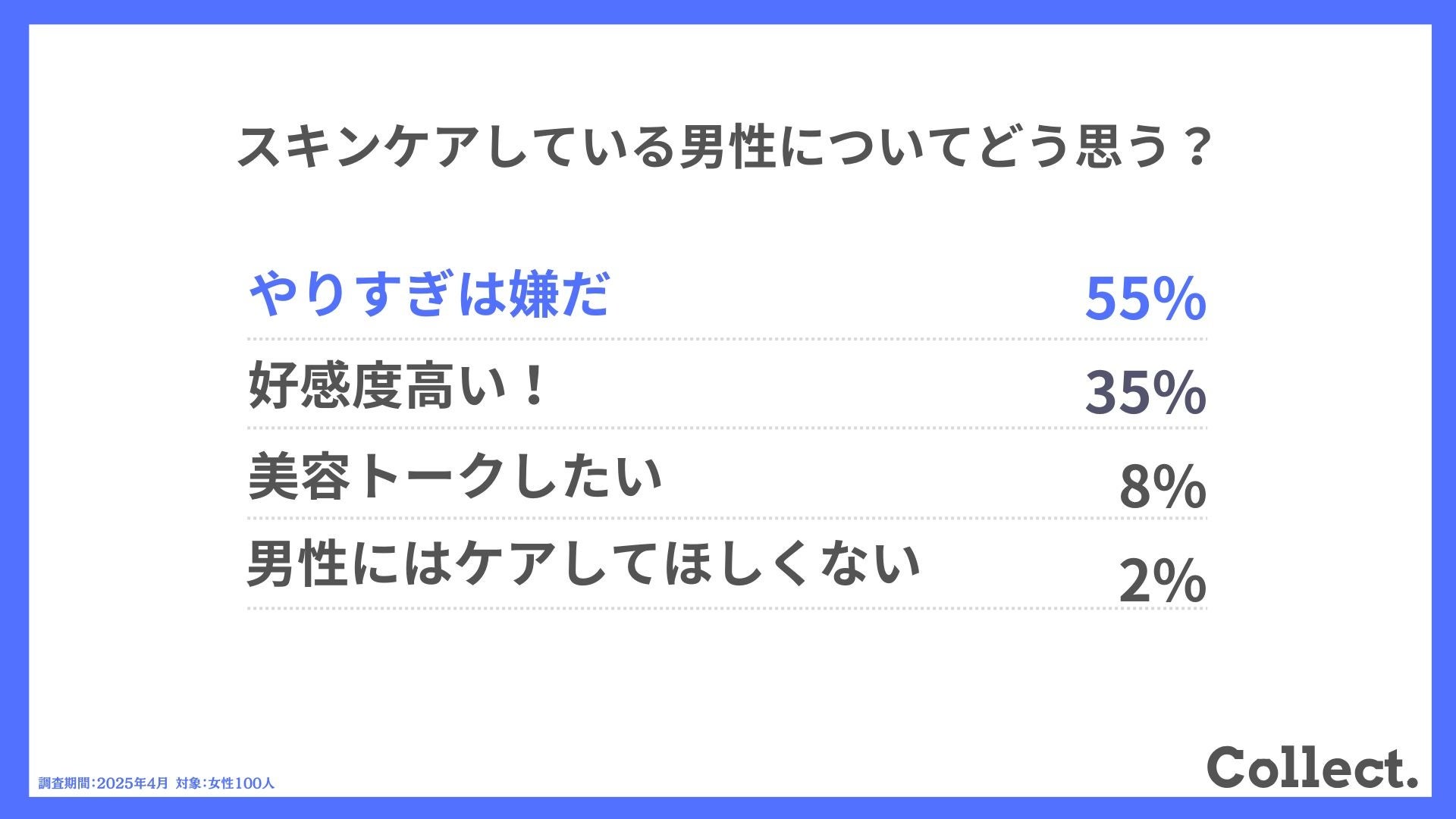 最多は「やりすぎは嫌だ」で55%。とはいえ「好感度が高い」や「美容トークしたい」と肯定的な意見も多く、自然なケアが支持されているようです。