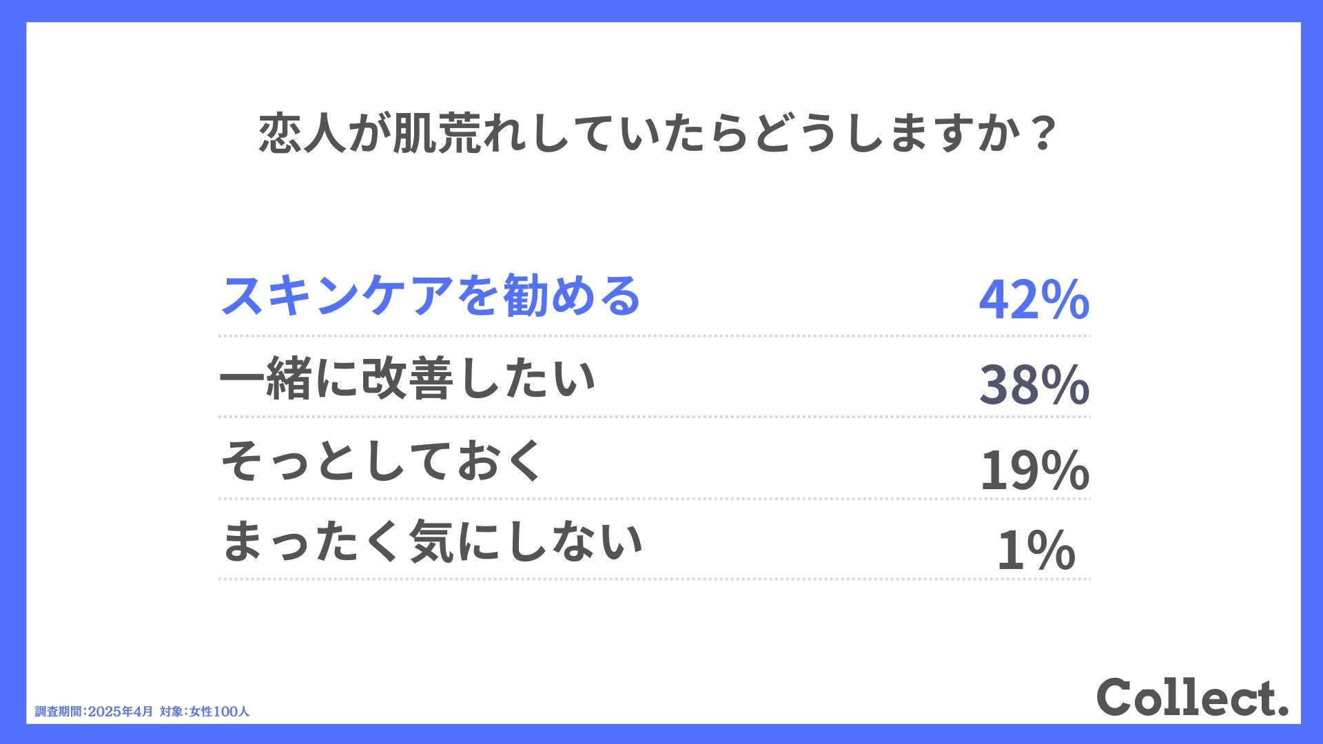 「スキンケアを勧める」「一緒に改善したい」が8割を占め、恋人の肌荒れに対してもポジティブに寄り添う女性が多数派という結果となりました。