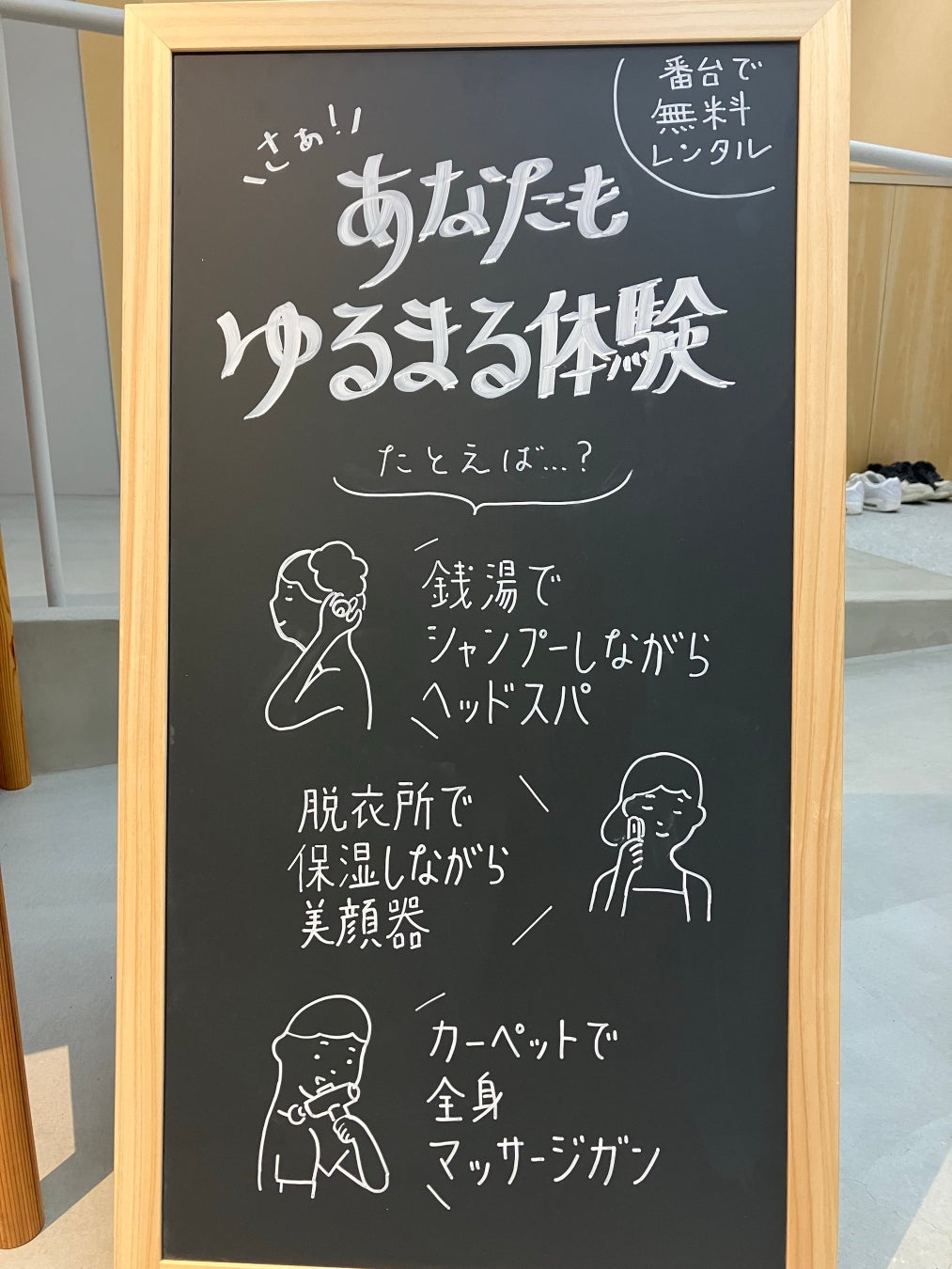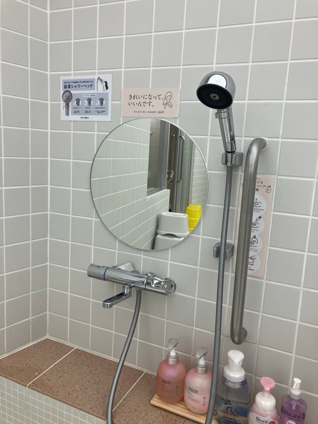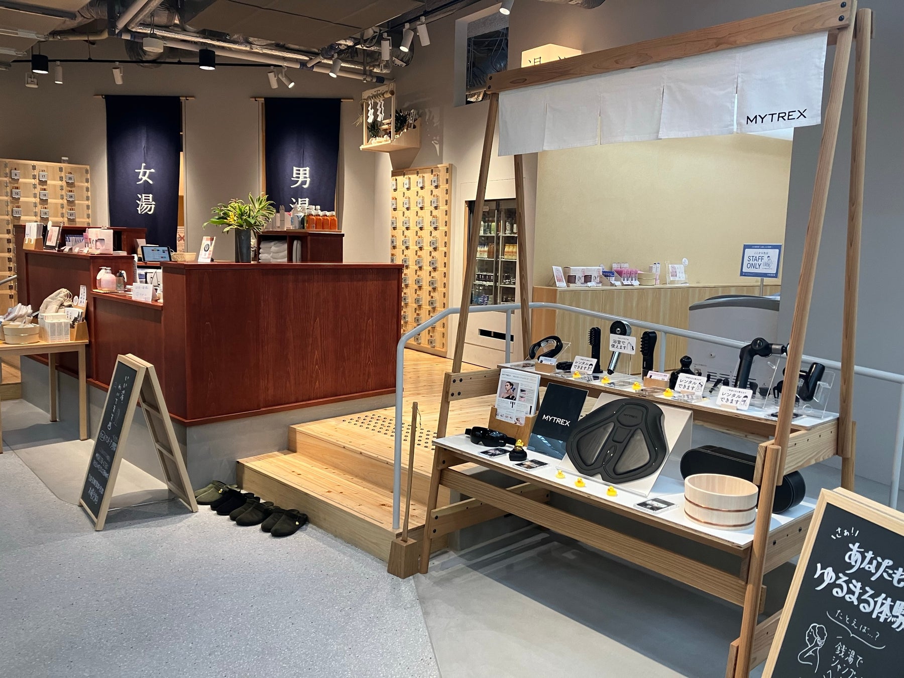 銭湯の中には男女湯ともにMYTREXの最新シャワーヘッドを2台ずつ設置。さらに、電気針ヘッドスパやトータルリフト美顔器を番台でレンタルしてお使いいただけます。
