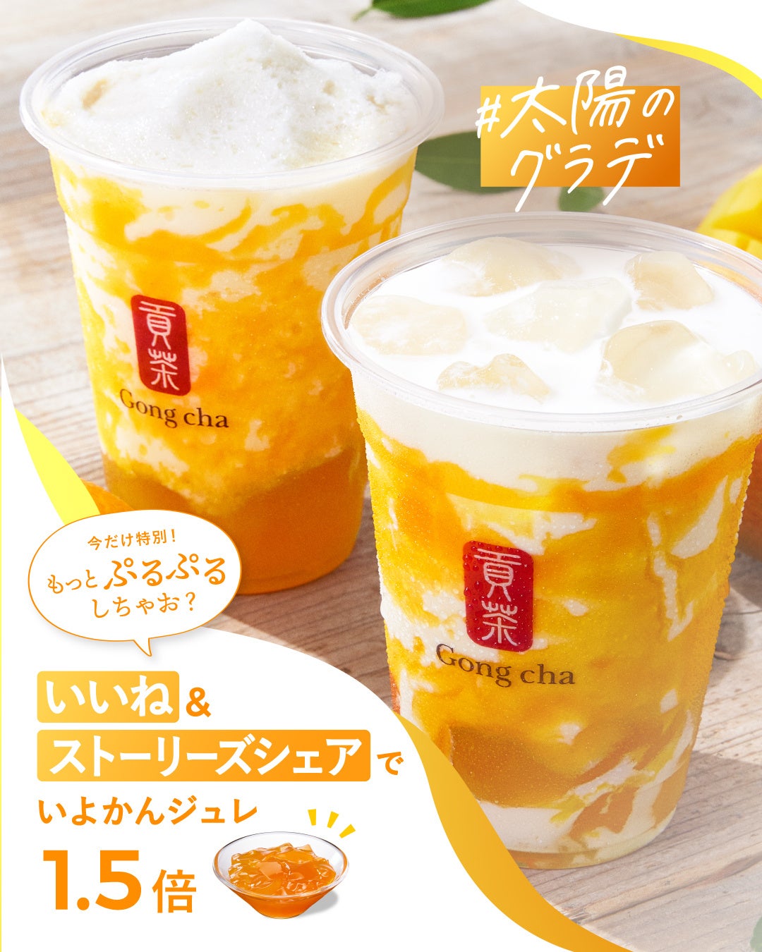 ゴンチャ ジャパン公式 Twitter アカウントまたはInstagramをフォローの上、対象の投稿をリツイートまたはいいね&ストーリーズでシェアしてください。店頭にて同商品をお買い上げいただく際、対象の投稿画面をクルーにご提示いただくと、「いよかんジュレ」を1.5倍トッピングさせていただきます。