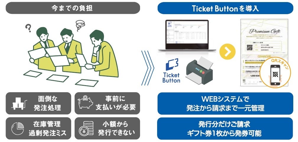 Ticket Buttonは、今までの販促ギフトの手間を軽減し、PayPayポイント※などのキャッシュレスポイントや商品と交換できるチケットの発券が可能な、新しいデジタルチケット発券システムです。