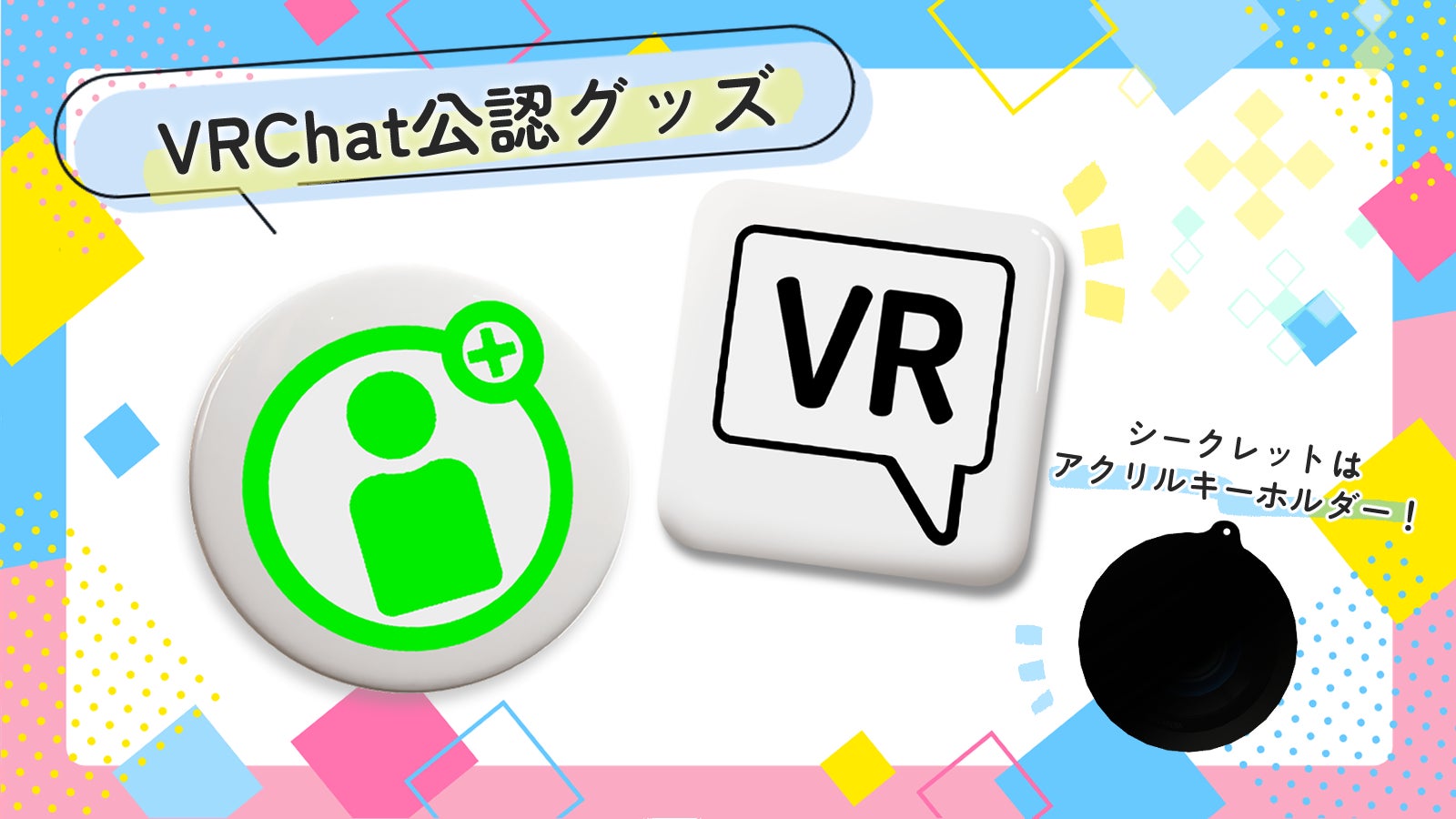 来場者限定の特典としてVRChat公認の缶バッジが当たる無料ガチャをご用意。グッズは全3種類(通常2種+シークレット1種)をご用意。