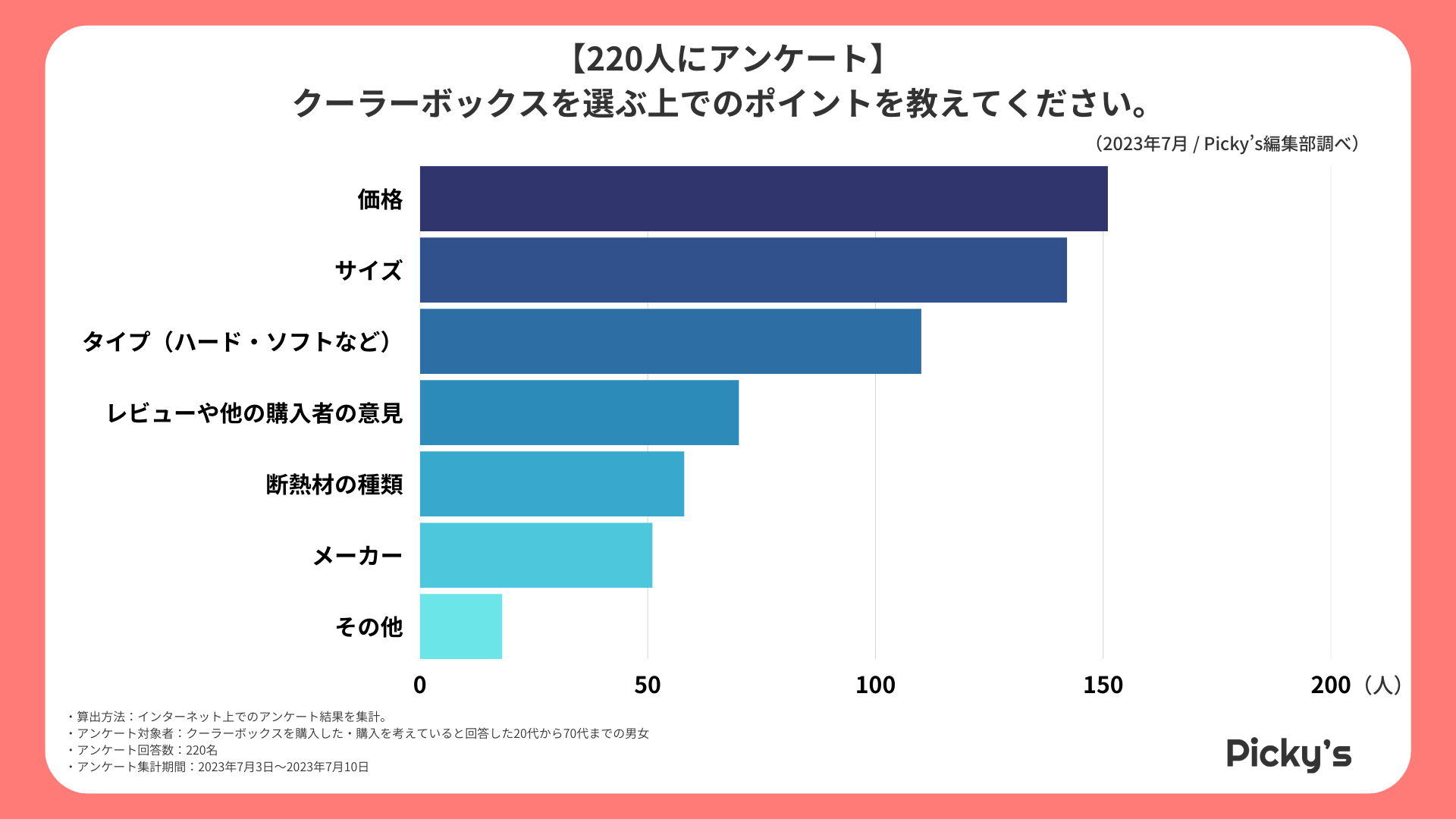 クーラーボックスを選ぶポイントとして、一番多かった回答は「価格」、その次は「サイズ」「タイプ(ハード・ソフトなど)」と続く形となりました。