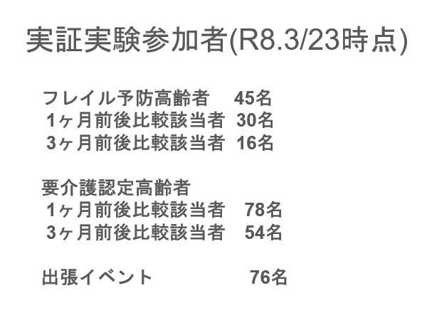 フレイル予防高齢者:運動習慣の定着、CS-30 の改善、健康意識の向上要介護高齢者:うつリスクの大幅低下という、身体機能と精神的健康の双方にポジティブな変化が確認されました。
