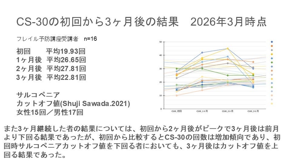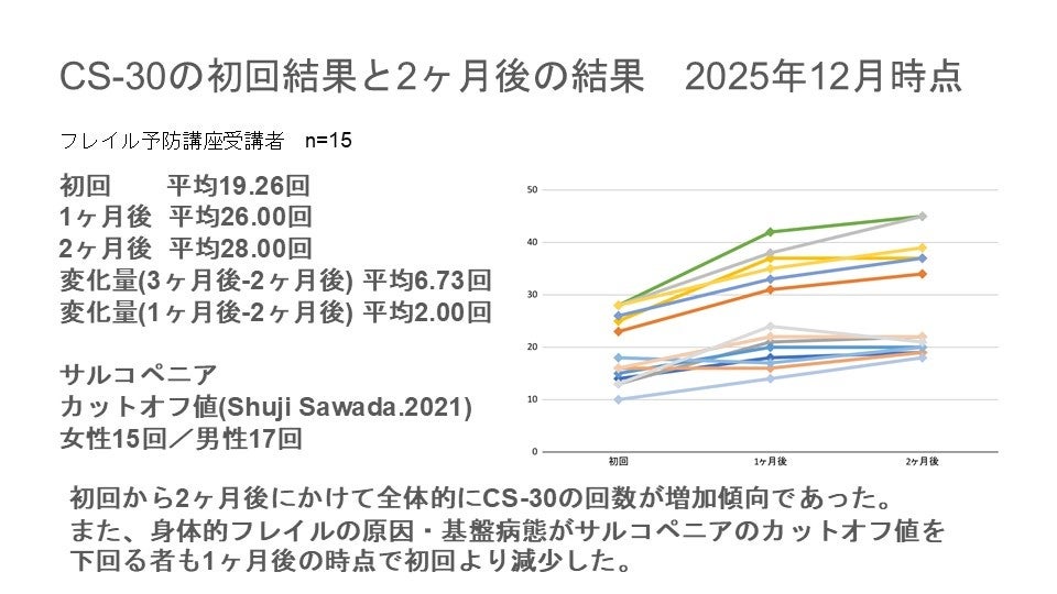 初回にサルコペニア基準(女性15回/男性17回)を下回っていた者が、3ヶ月後には基準値を上回った。