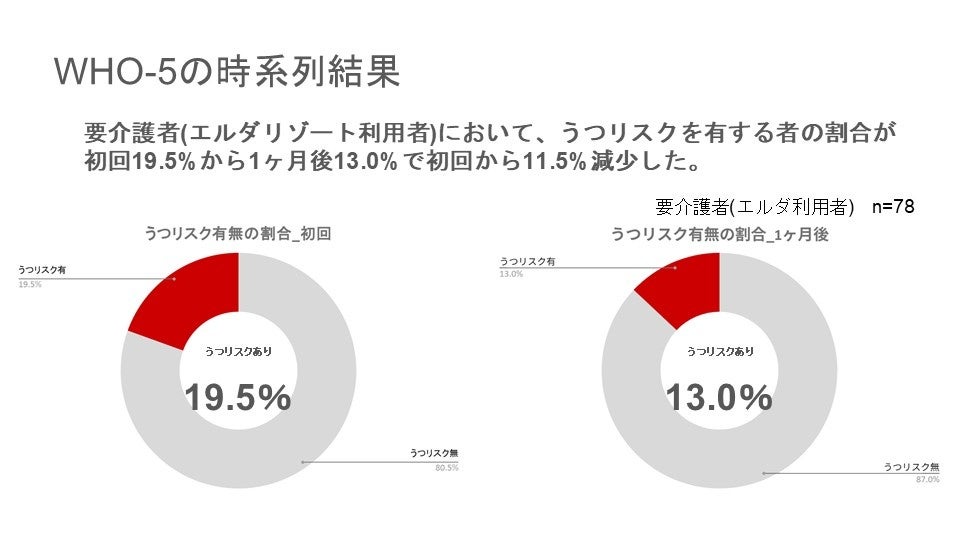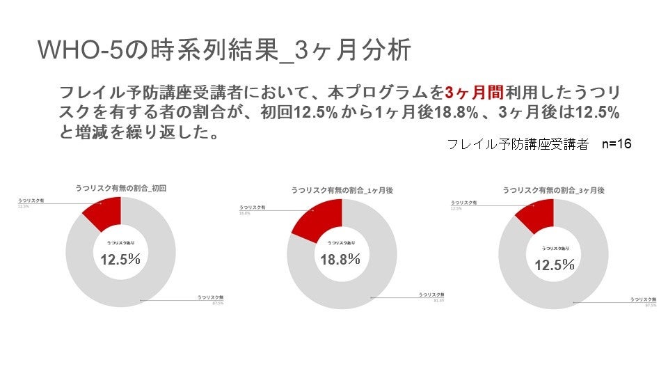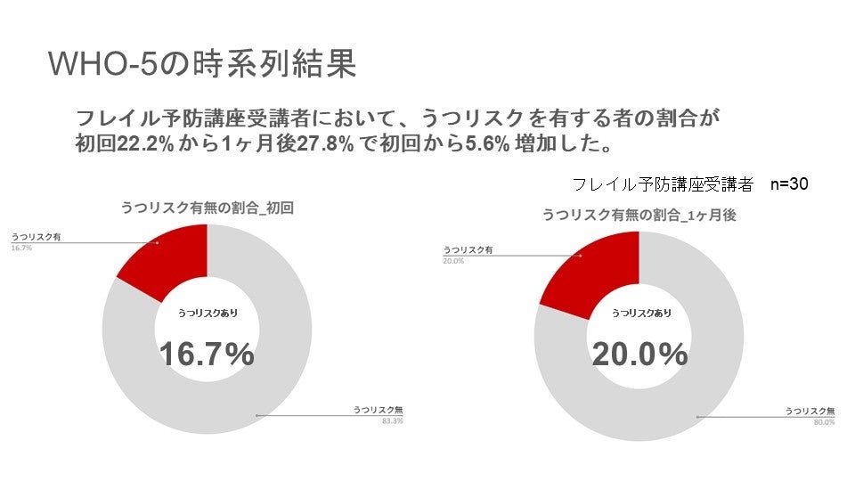 フレイル予防講座の中で、別クラスとして、要介護高齢者の WHO-5 を分析したところ、うつリスクの大幅な低下が確認されました。