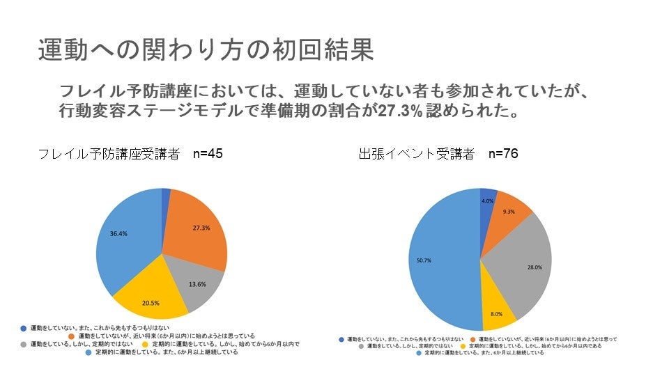 本取組においては、デジタルスポーツや筋力トレーニングマシンの活用、トレーナーによる運動のサポートは、運動行動の定着を強力に後押しした ことが示されました。