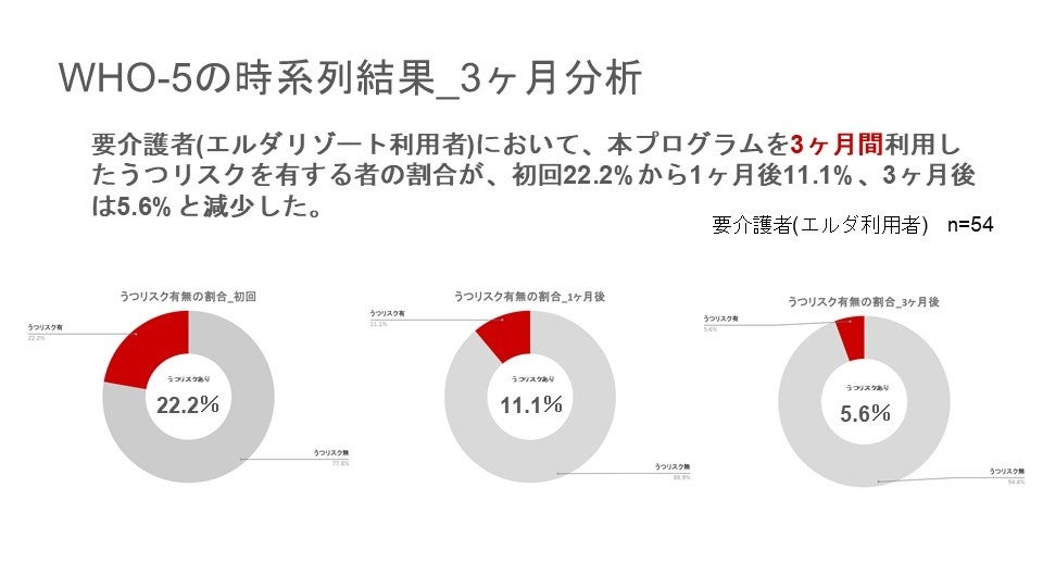 さらに、同じデジタルスポーツを活用したプログラムを利用する 要介護高齢者(n=54) においても、うつリスクが22.2%→5.6%へ低下 するなど、心理的健康の改善が確認されました。