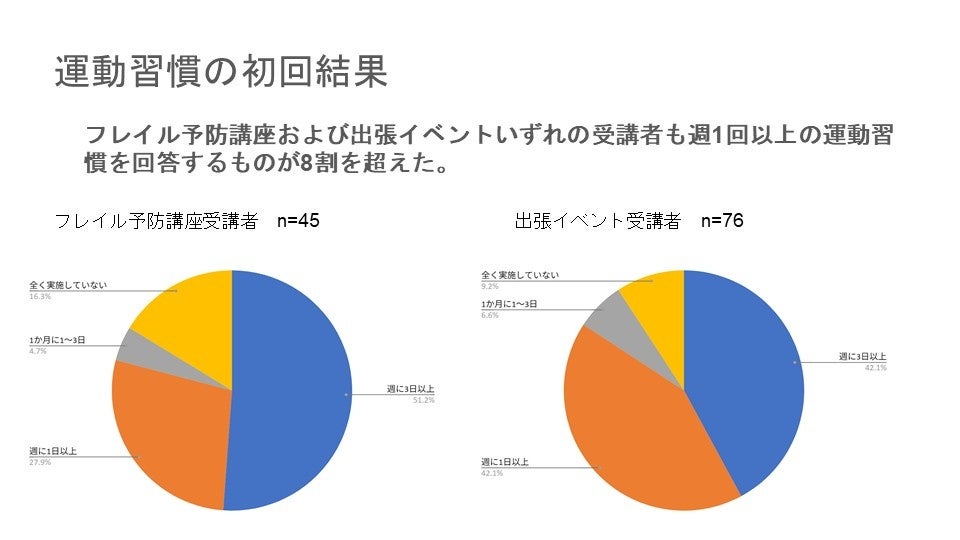 初回時点では運動習慣がない参加者もいたにもかかわらず、3ヶ月後には 全員が週1回以上の運動習慣を獲得。
