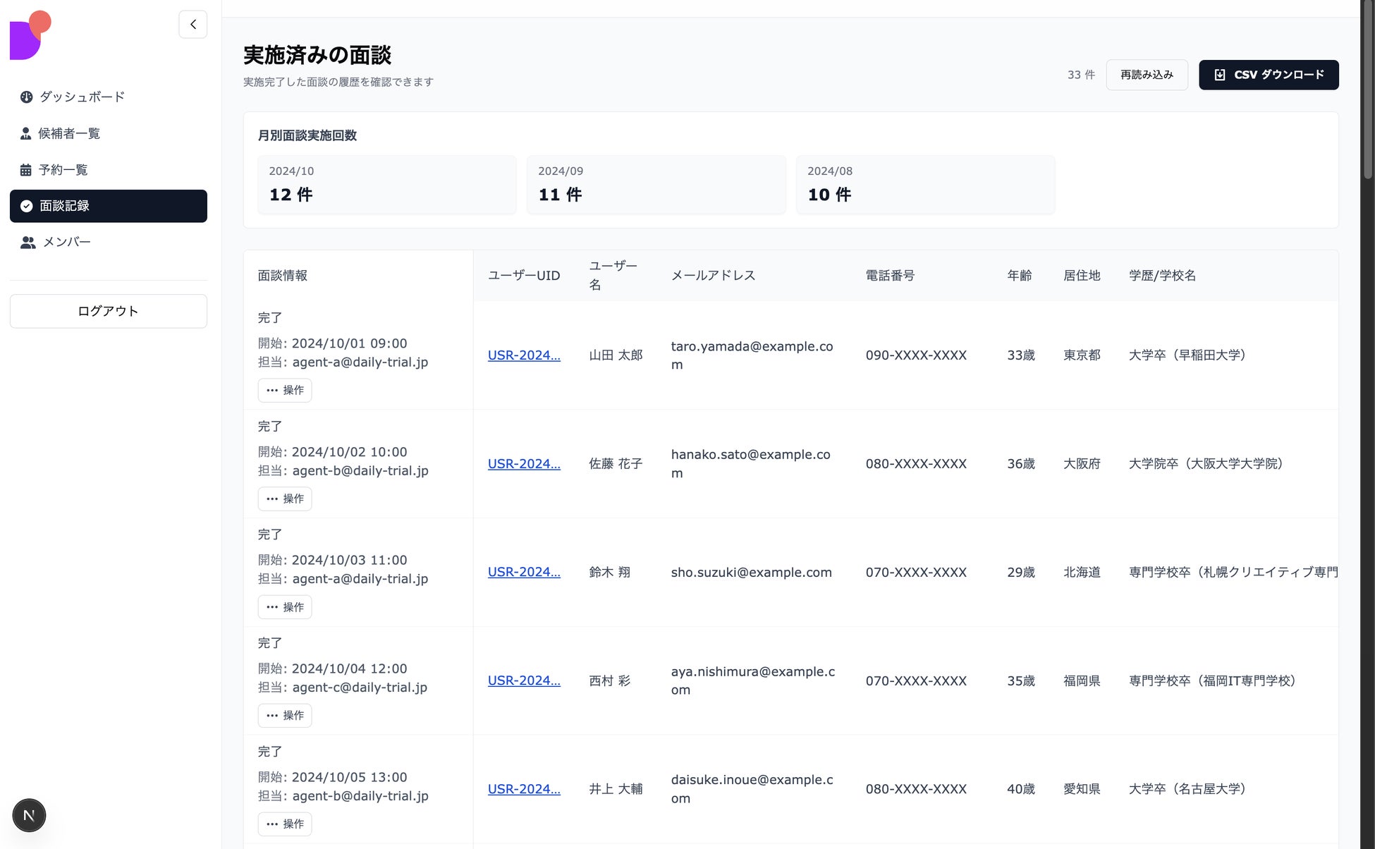 候補者の集客からプロフィール情報の取得、面談前日のリマインド、初回面談の同席まで、デイトラが一貫してフォロー。専用CRMで候補者情報の一元管理や面談オファーも効率的に行えます。