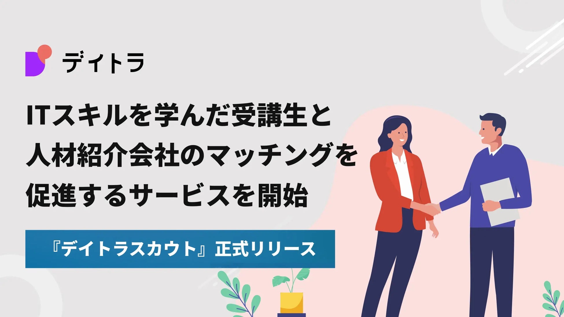 オンラインスクール運営の株式会社デイトラ(本社:東京都豊島区、代表取締役:大滝昇平)は、IT人材紹介サービス 「デイトラスカウト」 を本日正式にリリースいたしました。
