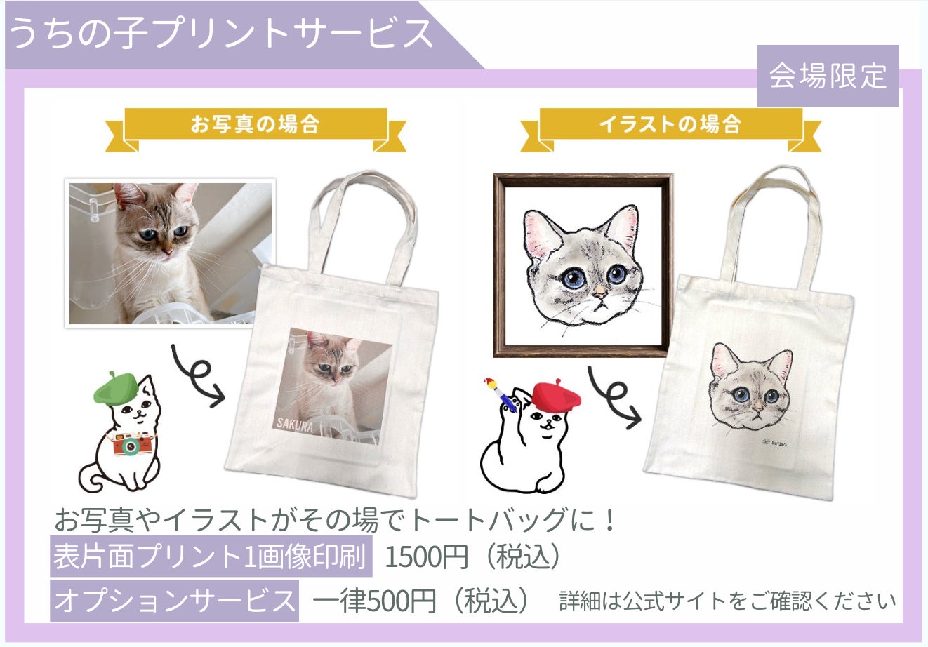 会場1階ではお写真やイラストをそのままトートバッグに印刷するプリントサービスや、クリエーターさん、ブランド商品の展示販売、SUMIKAスタッフによる無料ワークショップも予定しています。