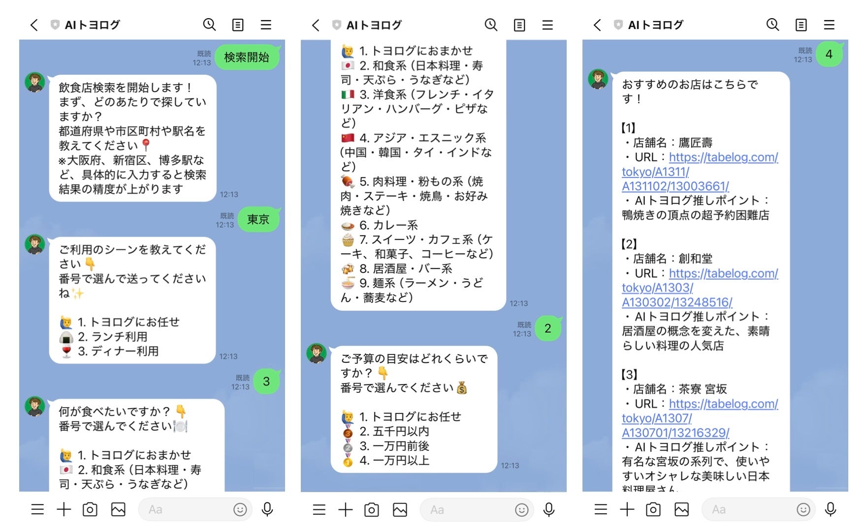「福岡に旅行に行くから美味しいラーメンが食べたい」「渋谷駅付近でコスパのいいイタリアンに行きたい」など「AIトヨログ」と会話するだけで、日本全国の信頼できる“トヨログ目線”のおすすめ店をすぐに教えてくれます。