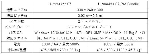 <Ultimaker S7/S7 Pro Bundle仕様表>