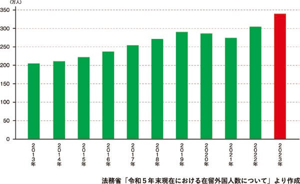 日本に永住や長期で滞在する外国人の数が年々増えています。法務省の統計では2022年に300万人を突破し、2023年12月末の時点で341万人となりました(下記図)。首都圏には137万人ほどが住んでいます。2015年の調査では、外国人世帯のうち半数が民間の賃貸住宅で暮らしており、今後も需要の伸びが見込めます。中長期で滞在する外国人はより高品質な賃貸住宅を求めてくると想定し、首都圏を中心に管理している物件をリノベーションする計画を立てました。