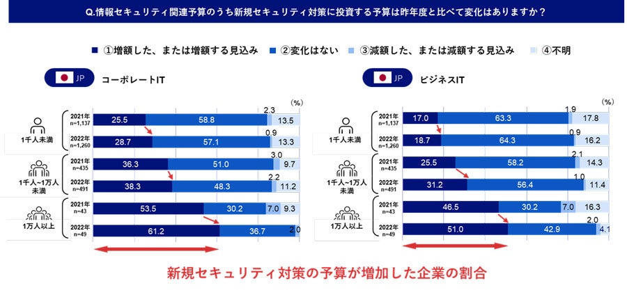 日本企業が新規のセキュリティ対策に投資する予算について、前年度との変化を尋ねたところ、2021年度の調査と比べて「増加した、または増加する見込み」と回答した割合が高い結果となりました。この傾向は、自社の情報システムのうち、コーポレートIT[i]およびビジネスIT[ii]のどちらの用途にも見られ、また従業員規模が大きい企業ほど、「増加」とする回答の割合が高くなっています(図4)。