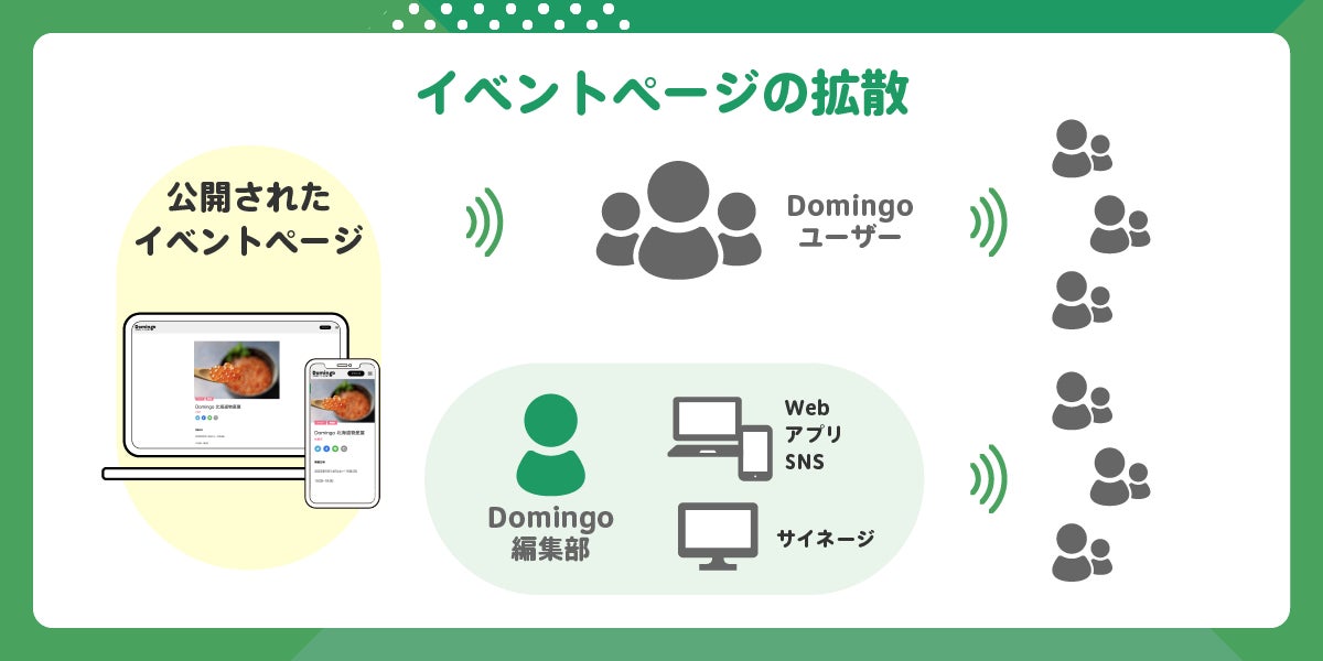「イベント投稿機能」は一般ユーザーがご自身でイベント情報を無料掲載できる機能ですが、掲載されたイベント情報の中から、Domingo編集部のスタッフがピックアップして記事や公式SNS等でご紹介することもございます。さらに、『Domingo』がイベント情報を提供している提携先のデジタルサイネージで紹介される場合もございますので、無料で活用できる有益なPR方法としてどうぞご注目ください。
