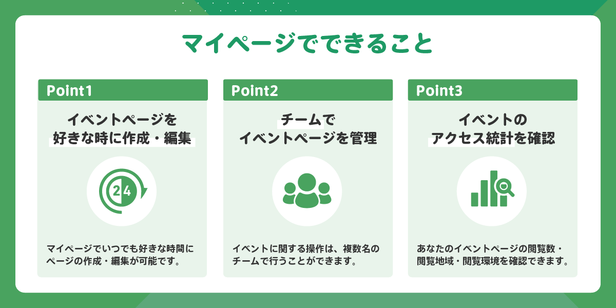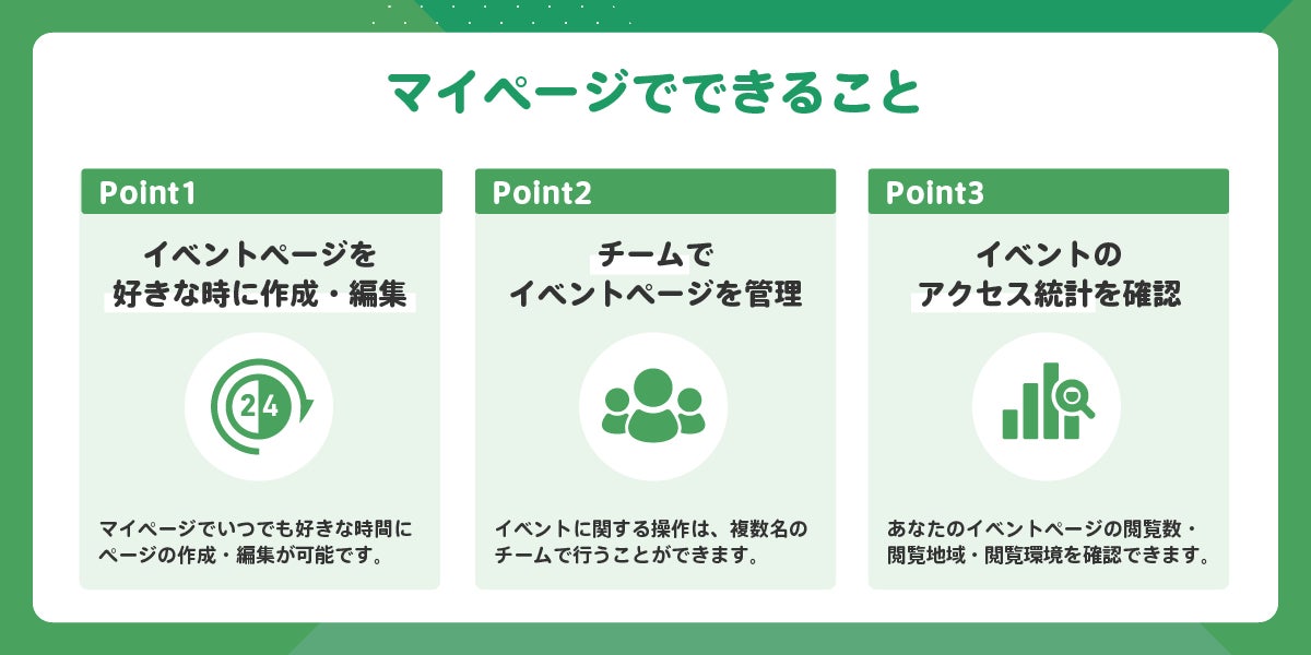 また『Domingo』公式Webサイトのマイページでは、ユーザーが主催者として投稿したイベントの閲覧数や閲覧地域(都道府県)、閲覧環境(PC / Android / iOS)もご確認いただけます。もちろん、使用料は一切発生いたしません。参考データとして、存分にご活用ください。