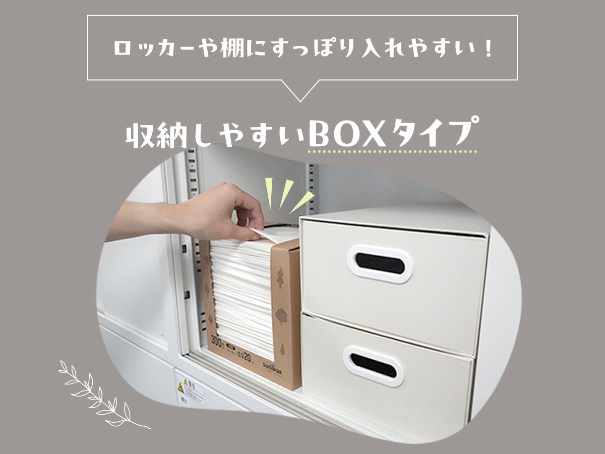 「nocoo(ノクー) BOX 45L 300枚」はキャビネットなどに収納しやすい立方体フォルムで、300枚と大容量となっているので頻繁に買い足す必要がありません。