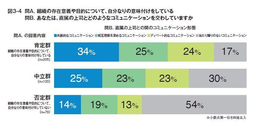 ◎ パフォーマンスや成長意欲への自己評価が高い部下グループ(以下、肯定群)の3人に1人が、直属の上司と「共創的なコミュニケーション」をとっている