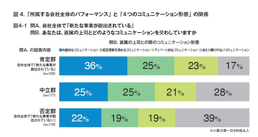 また、図4-1のように、この「コミュニケーション形態とパフォーマンスの肯定度合い」の関係性は、部下自身だけでなく所属する組織全体のパフォーマンスに関する設問でも同様であることが分りました。