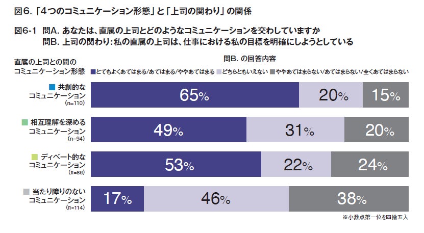 実際、「上司が仕事における自分の目標を明確にしようとしていると思うか」という問いに対して、共創的なコミュニケーション群は肯定的回答が65%に対して、当たり障りのないコミュニケーション群はわずか17%にとどまるなど、上司の自分への向き合い方に対する印象に大きな開きが見てとれました。