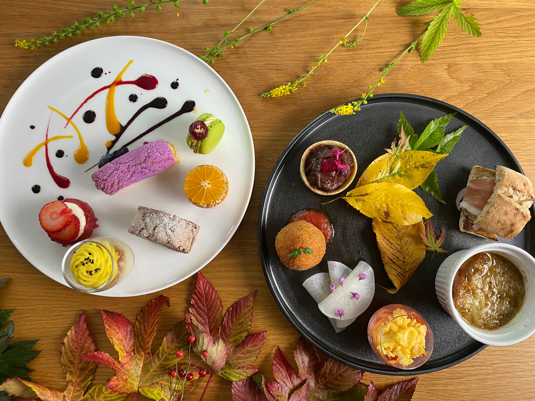 ブルーベリーとカシスのエクレアや、温州みかんのタルト、ピスタチオのマカロン、トンカ豆のプリンなど、ジミー大西のキャンバスから飛び出したような彩り豊かなスイーツが並びます。鮮やかな色と異国の香りが重なり合い、まるで旅するような余韻を味わえます。