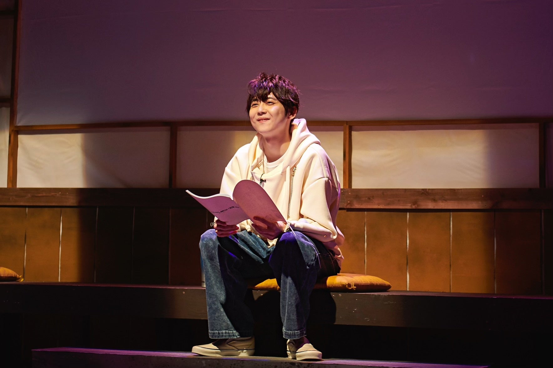 配信がスタートするとMCの優木かなさんからの紹介を受け、縁側セットの中の大きなスクリーンをバックに、梶さん、古賀さん、鷲尾さんが登場しました。昨年のオンライン朗読劇「夢中さ、きみに。」にも出演した梶さんは「新たなYouTubeチャンネル“どっぷりサーモスチャンネル”での生朗読です。前回に引き続き、今回も、美術や照明などの空間づくりがとても素敵なので、そんな雰囲気のなかお芝居ができるのが幸せです。」と挨拶しました。
