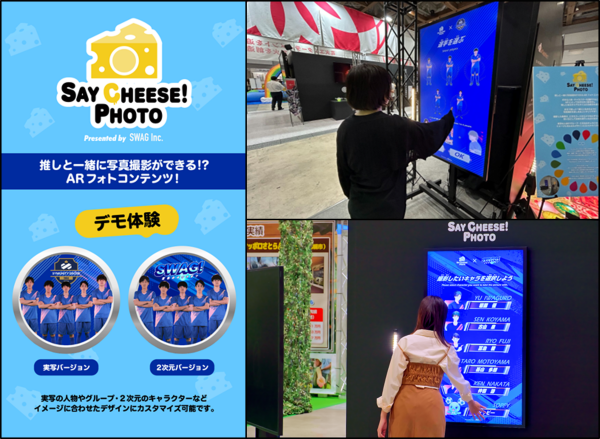 本展示では、AR技術を活用し、来場者が好きな人物やキャラクターと一緒に撮影できる、インタラクティブフォト体験「SAY CHEESE! PHOTO」を展示します。撮影した写真はスマートフォンに保存でき、SNSでの共有やイベント後の体験想起につながります。