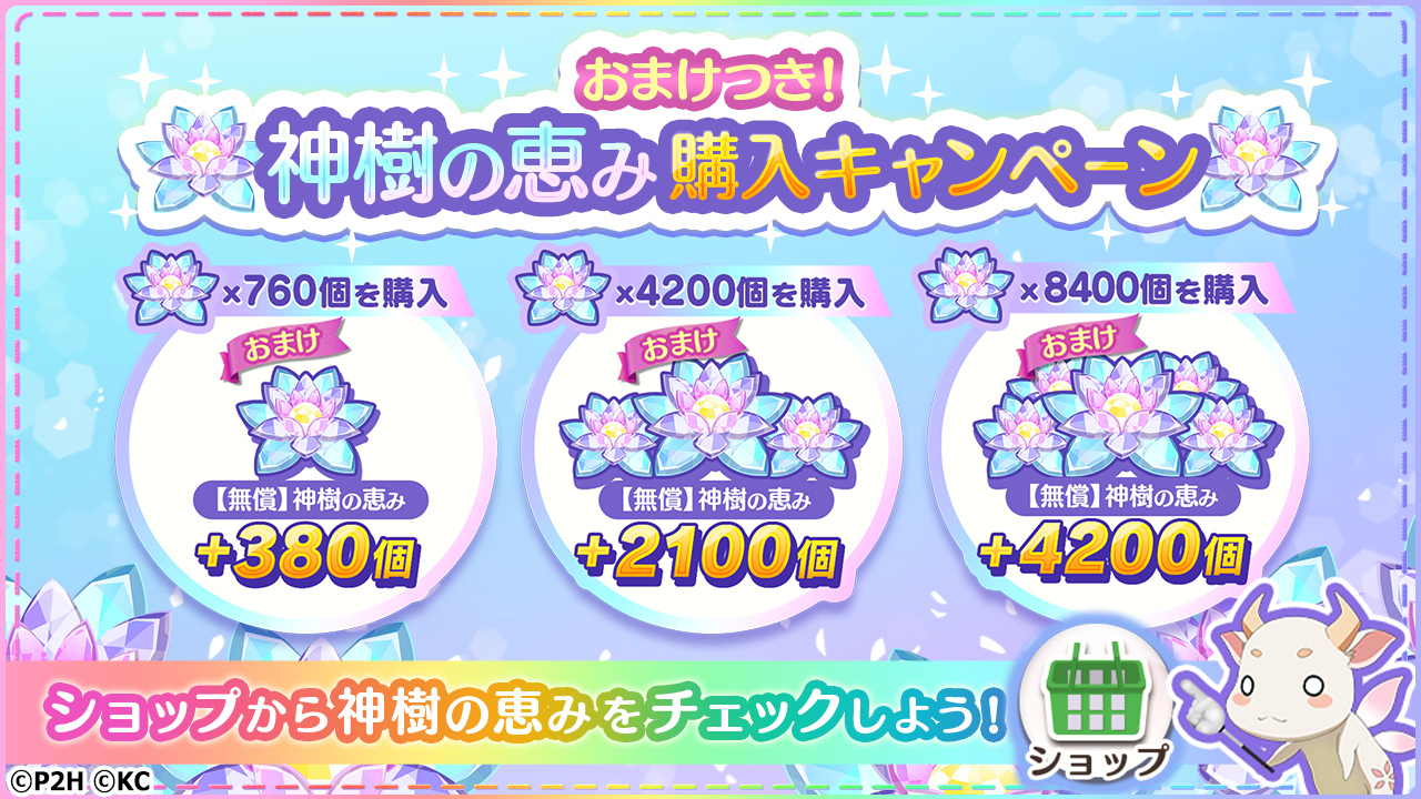 期間中、ショップに「神樹の恵み(無償)」のおまけ付き「神樹の恵み(有償)」のアイテムが追加されます。
