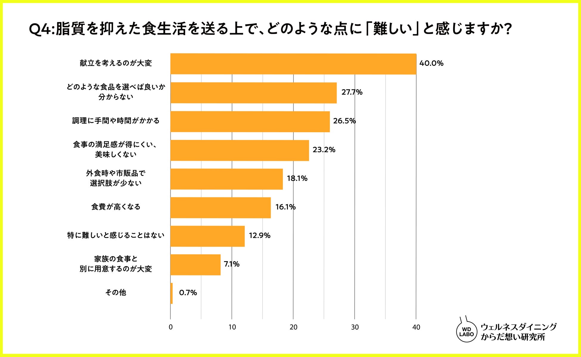 脂質を抑えるうえで最も多い悩みは「献立を考えるのが大変」(40.0%)となり、次いで「どのような食品を選べば良いか分からない」(27.7%)や「調理に手間と時間がかかる」(26.5%)となった。食事の用意に対する負担や、食品の選び方などの知識が不足していることが明らかになった。