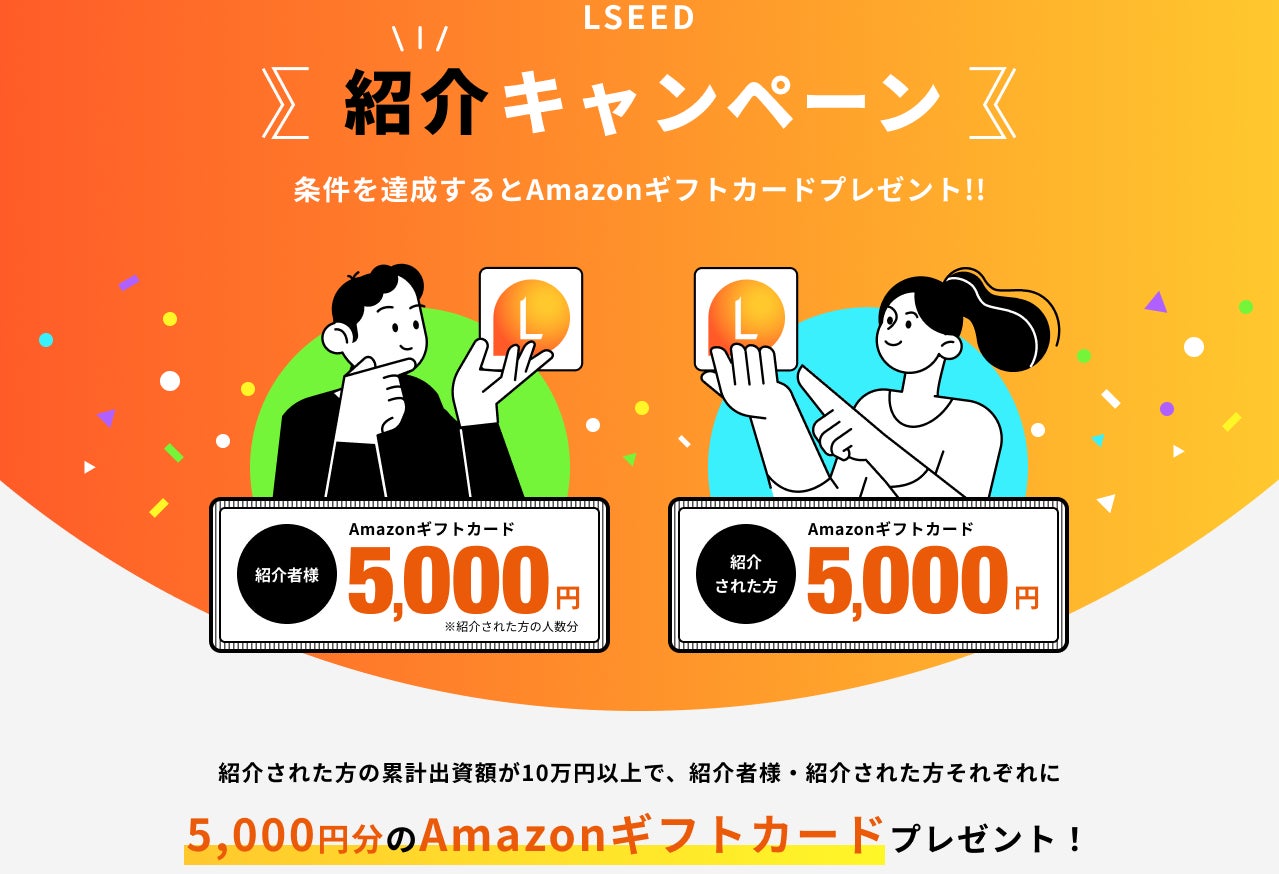 紹介された方の累計出資額が10万円以上で、紹介者様・紹介された方それぞれに5,000円分のAmazonギフトカードプレゼント!