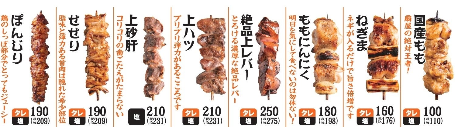 【国産もも串100円!】やきとりの扇屋がグランドメニューを変更。炭火で焼く本物の焼き鳥「国産もも串」を1本100円(税込110円)に価格改定しました!