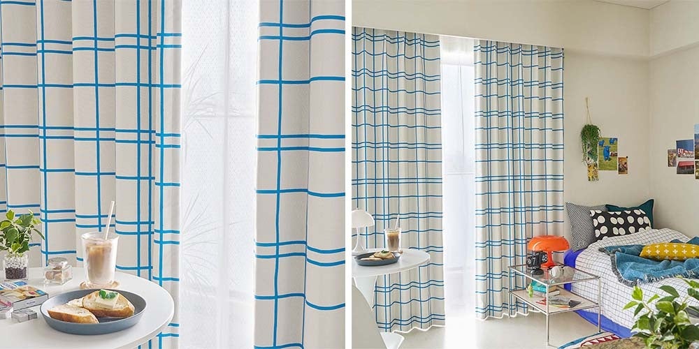 地図を真上から覗いたようなブルーラインのチェック、クリームチーズのようなミルキーなカラーリングがかわいい、ニュートロポップな遮光カーテンです。