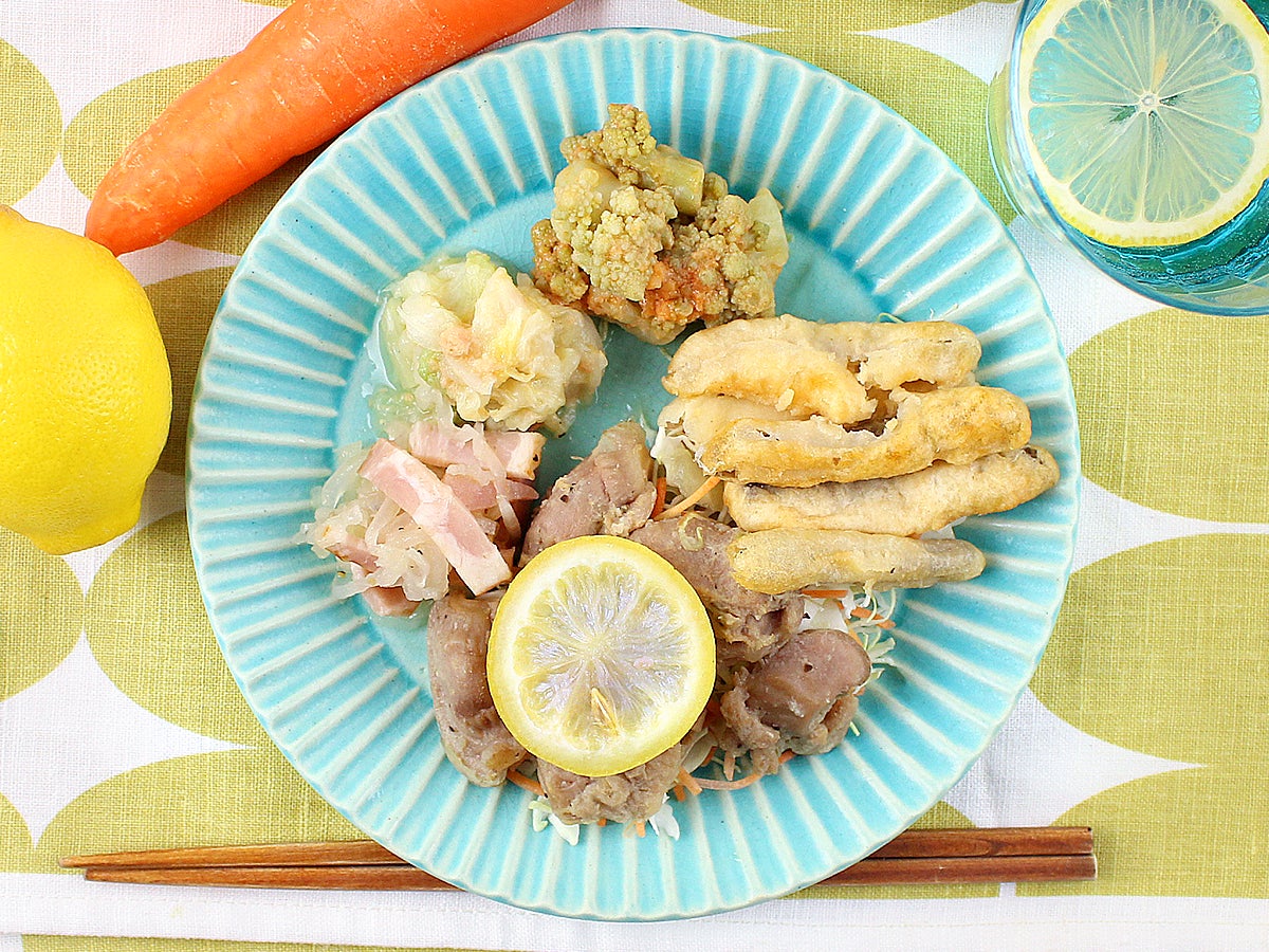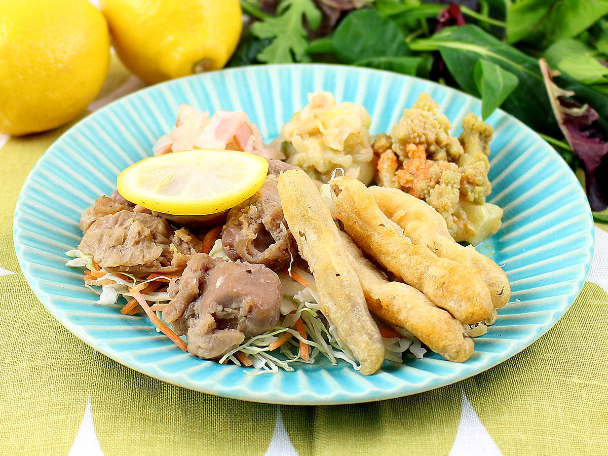 コリコリした食感でスパイシーな鶏の砂肝焼きとゴボウのから揚げを、コールスローサラダに合わせました。レモンの爽やかな酸味が砂肝の味を引き立てます。キャベツ、人参、玉ねぎのサラダが砂肝とゴボウの出汁を吸うので、野菜からも十分な旨味を感じていただけます。副菜は、大根とベーコンの黒胡椒あえ、白菜と鮭のガーリックバター、ロマネスコのカクテルソースです。