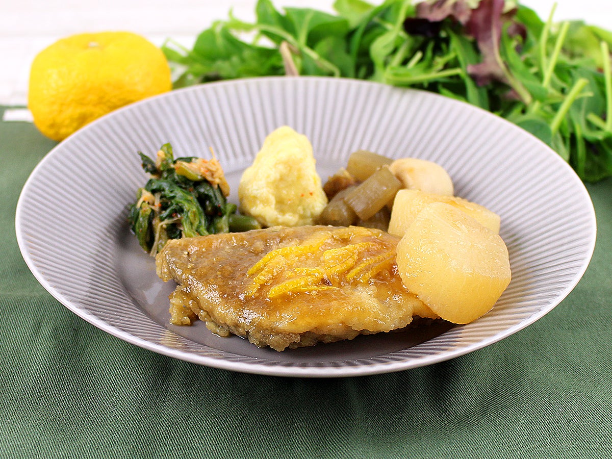 魚料理の定番ぶり大根を天然のぶりでご用意しました。煮崩れないように揚げて旨味を閉じ込めたぶりに大根を添え、ゆずを散らせてさっぱりとさせております。お出汁と甘みのある醤油をブレンドした和風だれを絡めてお召し上がりください。副菜は春を先取りした菜の花とえのきの辛味噌あえ、かぼちゃ豆腐、ふきと里芋煮です。