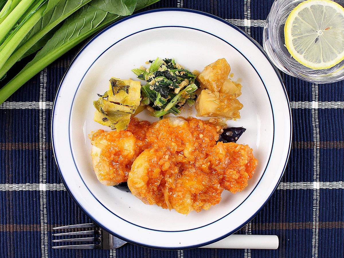 中華料理の定番海老のチリソースをご用意しました。米を原料とする中国の発酵調味料「酒醸(チューニャン)」を使用して、まろやかな甘さとコクのある味わいになっています。茄子と一緒にソースをたっぷり絡めてお召し上がりください。副菜は、絹揚げ豆腐の高菜がけ、ひき肉と青梗菜のあえ物、筍の甘酢あんです。