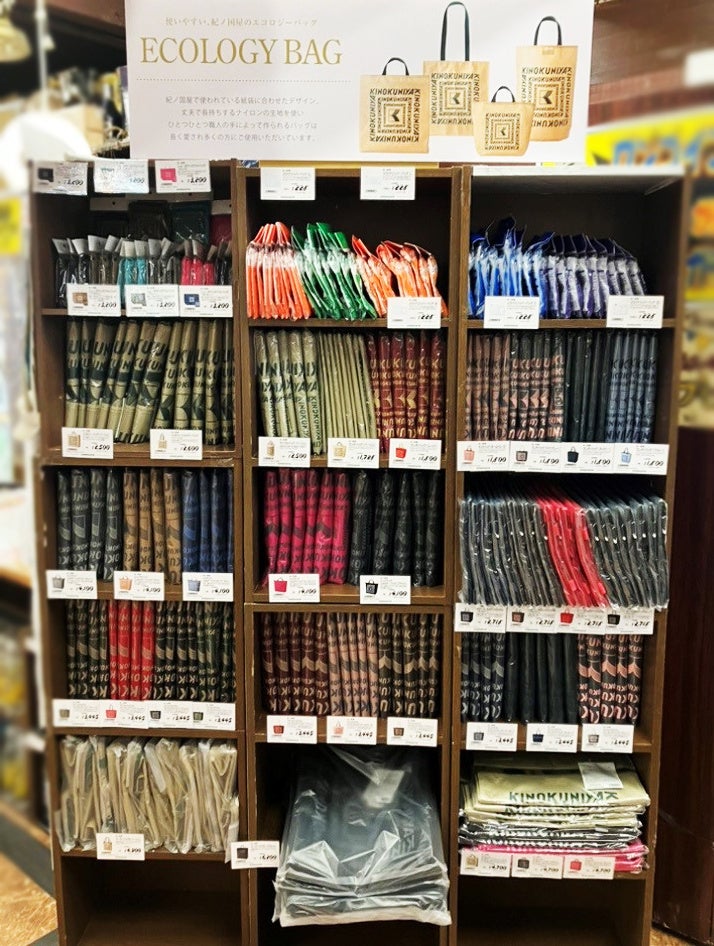 定番カラーのエコロジーバッグを始め、持ち手の長さが調節できる「アジャスタブルストラップバッグ」など40種類以上の雑貨、オリジナルバッグを販売中。