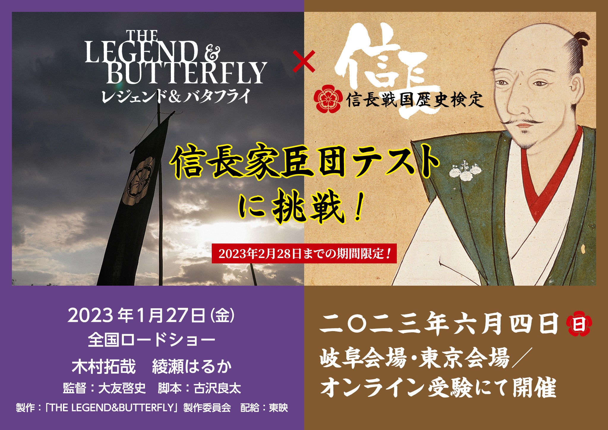 2023年1月27日(金)公開、映画『レジェンド&バタフライ』( https://legend-butterfly.com/ )とのコラボ企画、無料Web検定「信長家臣団テスト( https://www.kentei-online.com/nobunaga/legend-butterfly )」も実施中!問題の正解数をもとに、信長の家臣としてのあなたのレベルを診断!Web上で発行される診断書をTwitterへ投稿しよう!映画『レジェンド&バタフライ』オリジナルグッズを抽選で20名様へプレゼントします!